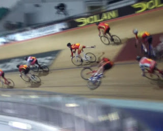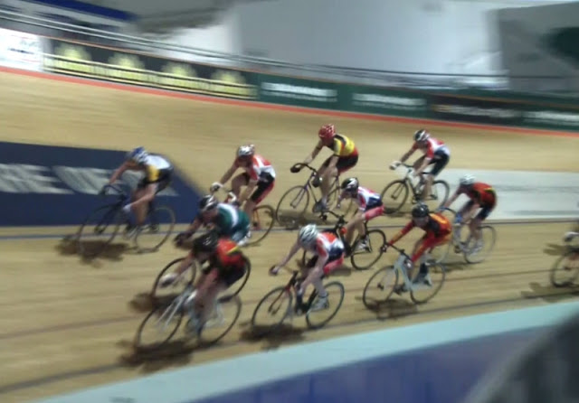 | 3 laps to go in the 25 lap scratch race with Bolton leading from Saddleworth with West Lothian on the outside and 3 Nottingham riders filling the ‘midfield’ with Stockport 3rd in line on the outside and Ben Hancock, Calder, 3rd on the inside. |