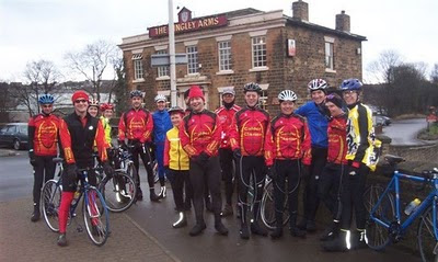 Temperatures didn’t get much above freezing point for the 21 riders who turned out for the final club run of 2005, from Horbury Bridge to Sid’s cafe of ‘Last of the Summer Wine’ fame, Holmfirth, on Boxing day.After the ride, there was a Christmas get together with other Calder Clarion members and friends at Boon’s Pub in Queen Street Horbury