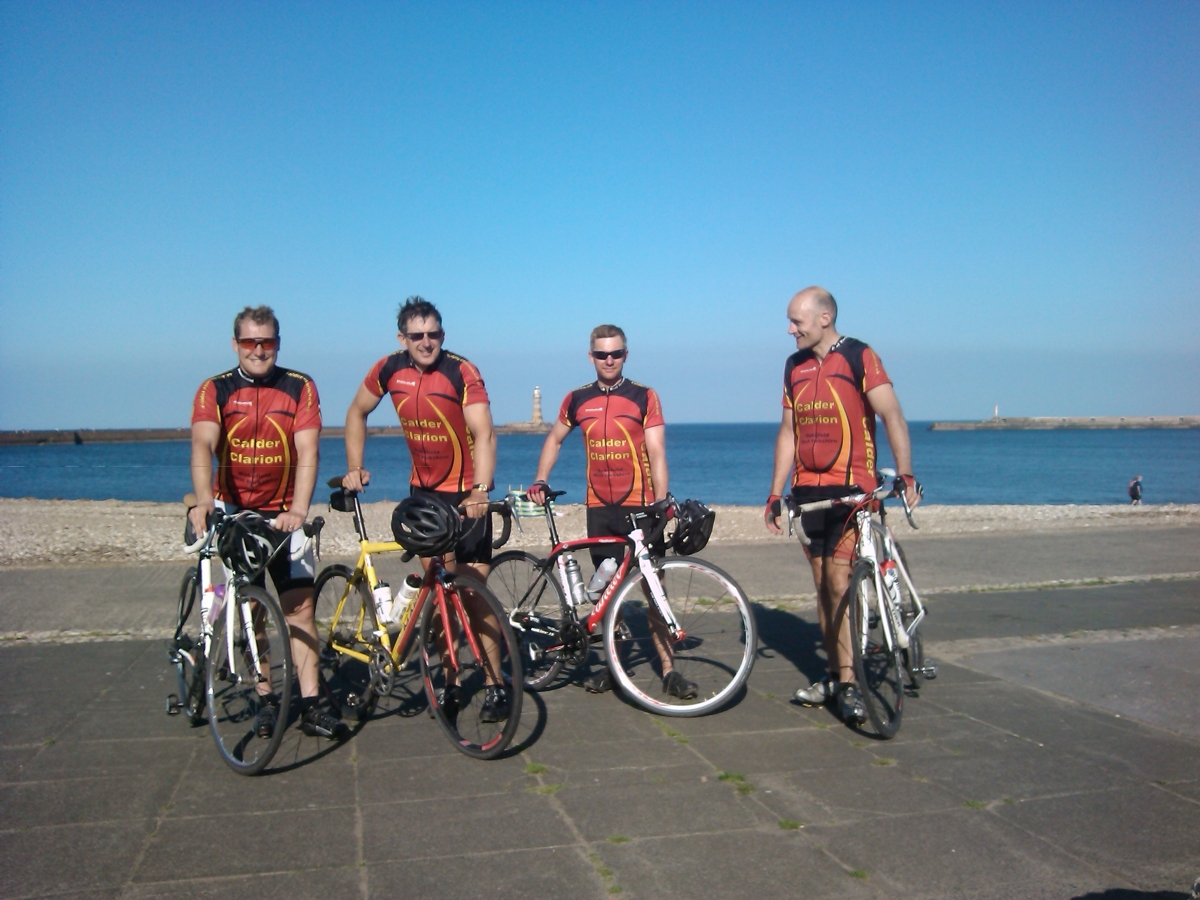 The Gold Standard C2C ride planned for May fell foul of the early season inclement weather. So of the original 8 riders, only 4, Martin Price, Matthew Dodsworth, Jonny Croston and Michael Vennard, posed for the obligatory picture in front of the C2C sign in the dock at Whitehaven in the early morning sun on Saturday 8thJune 2013.
