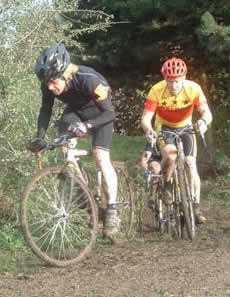 | Paul Milsom rides past a rival on a muddy uphill section in 2004/05 Yorkshire CCA Temple Newsome Fixture |
